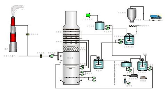 雙堿法脫硫工藝,由燃煤鍋爐(如電廠)產(chǎn)生的煙氣通過(guò)前級(jí)除塵器(電除塵器或布袋除塵器)進(jìn)行與除塵,經(jīng)與除塵后的煙氣由引風(fēng)機(jī)送入吸收塔進(jìn)行脫硫,吸收塔內(nèi)布置有多層噴頭,可噴出含有脫硫劑的水霧,煙氣中的SO2與吸收液進(jìn)行充分反應(yīng)、接觸后,沉降到塔底并流入灰水循環(huán)系統(tǒng)中,吸收后的吸收液經(jīng)再生劑重生后,沉淀的渣漿由渣漿泵送入渣漿處理系統(tǒng),進(jìn)行濃縮、過(guò)濾,得到石膏,濾液和沉淀后的上清液經(jīng)PH調(diào)節(jié)和補(bǔ)水后,供水泵循環(huán)利用,形成灰水壁爐循環(huán),既防止二次污染,又降低耗堿量和運(yùn)營(yíng)成本。脫硫除塵后的煙氣經(jīng)高效除霧器除去其中的過(guò)飽和水分,既防止二次污染,又降低耗堿量和運(yùn)營(yíng)成本。脫硫除塵后的煙氣經(jīng)高效除霧器出去其中的過(guò)飽和水分,達(dá)到排放標(biāo)準(zhǔn)后經(jīng)煙囪排入大氣。 |